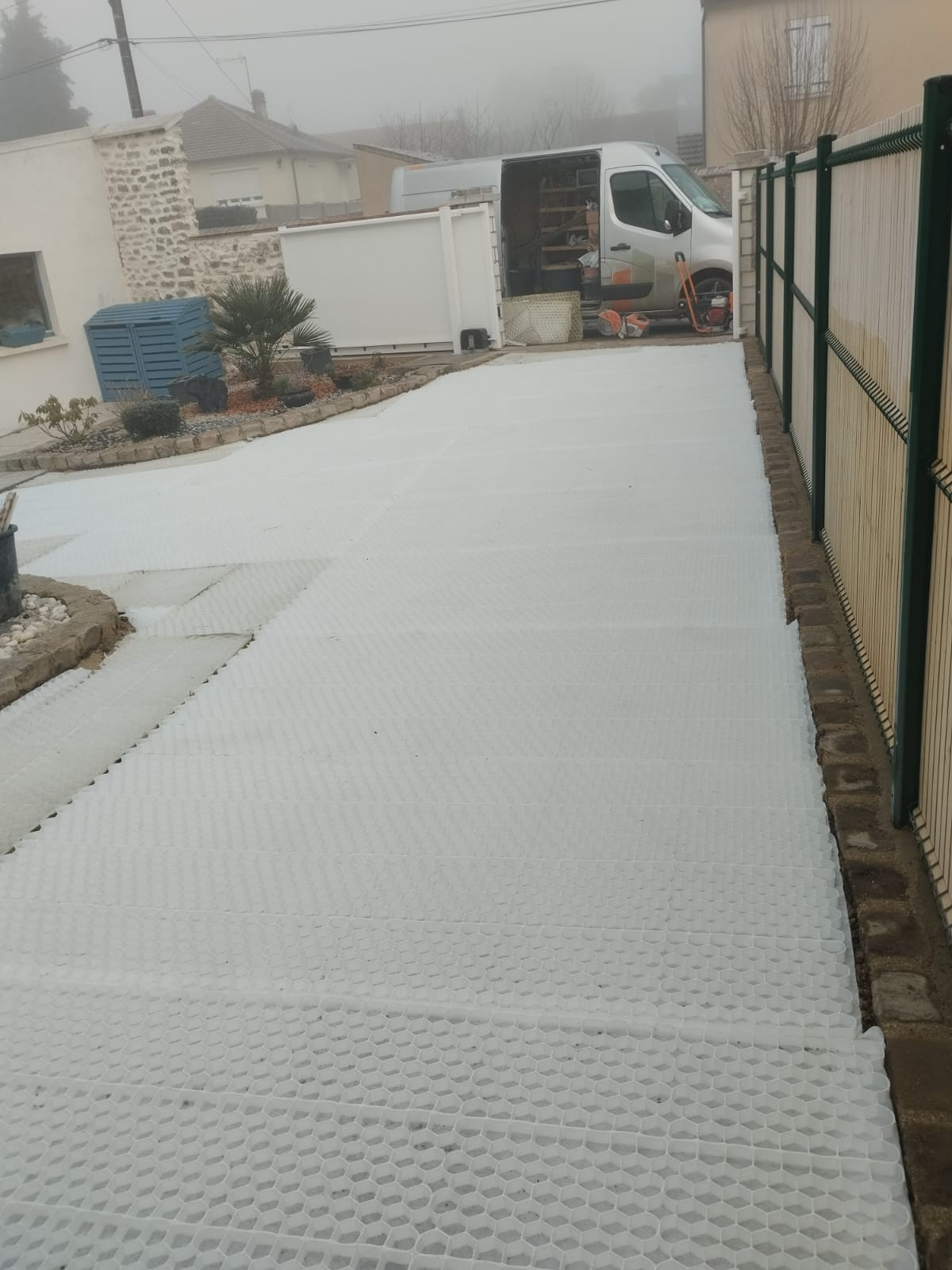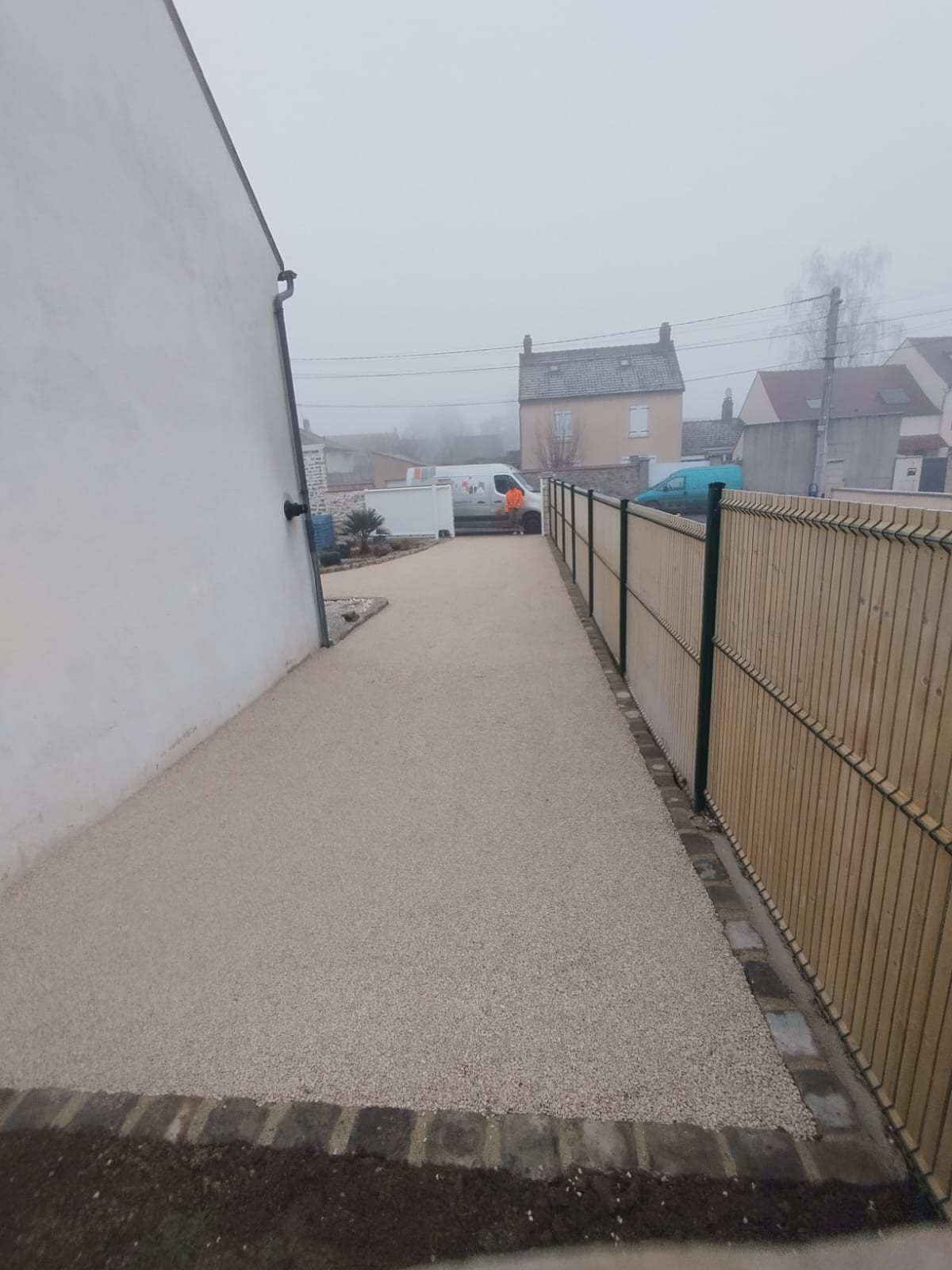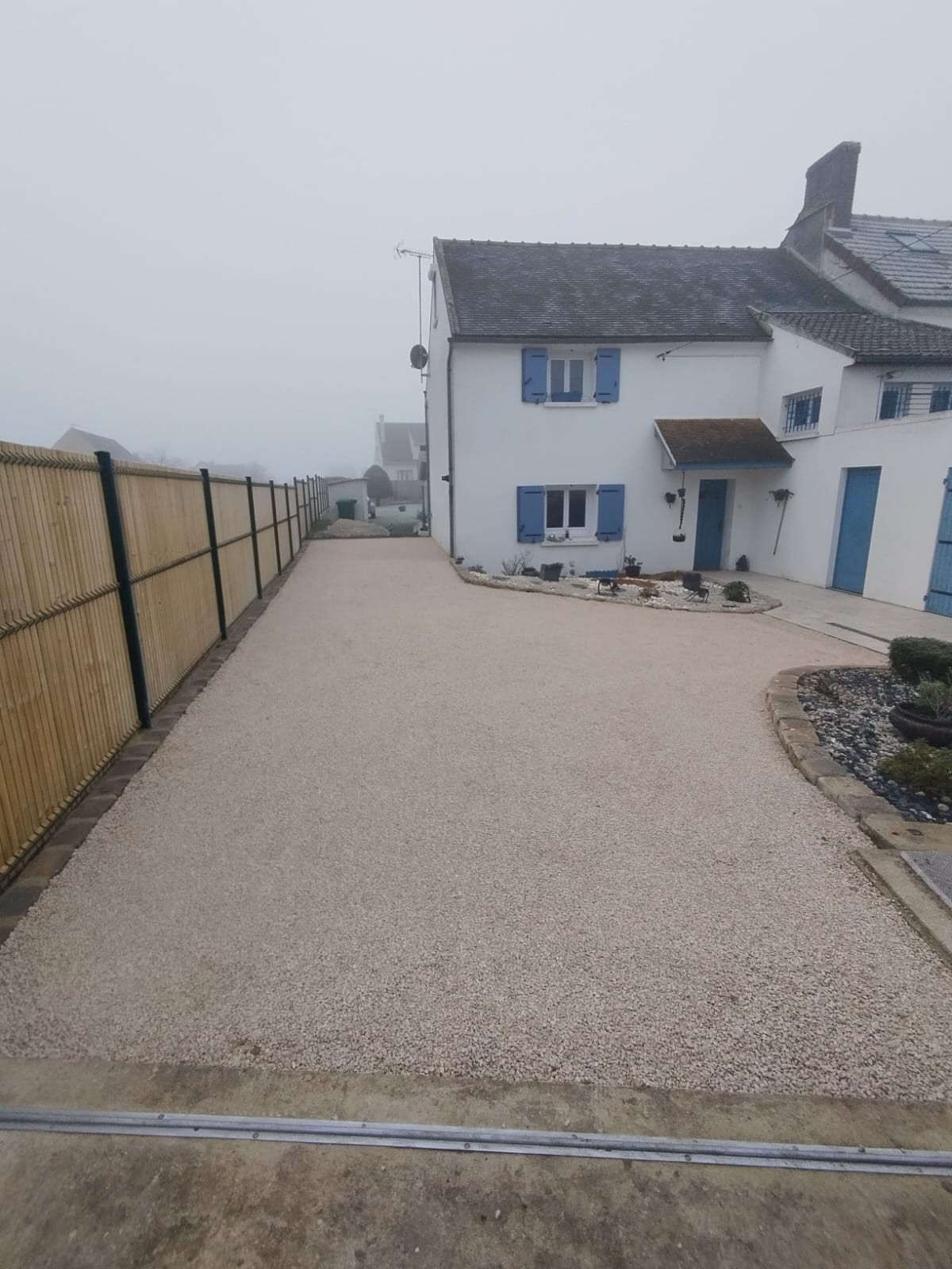 Aménagement d'une cour en gravillon et d'une clôture rigide avec occultant en bois à Silly le long
