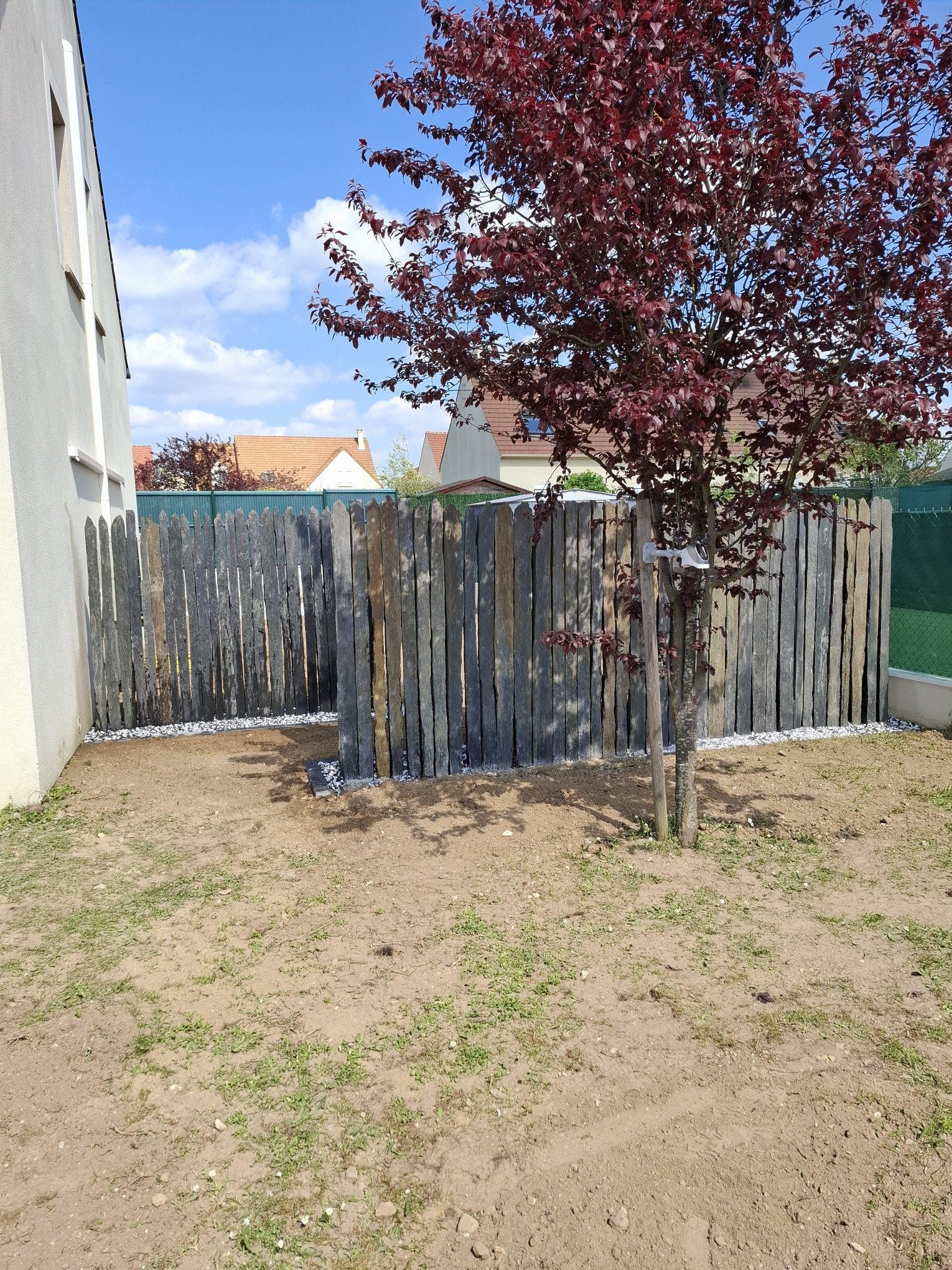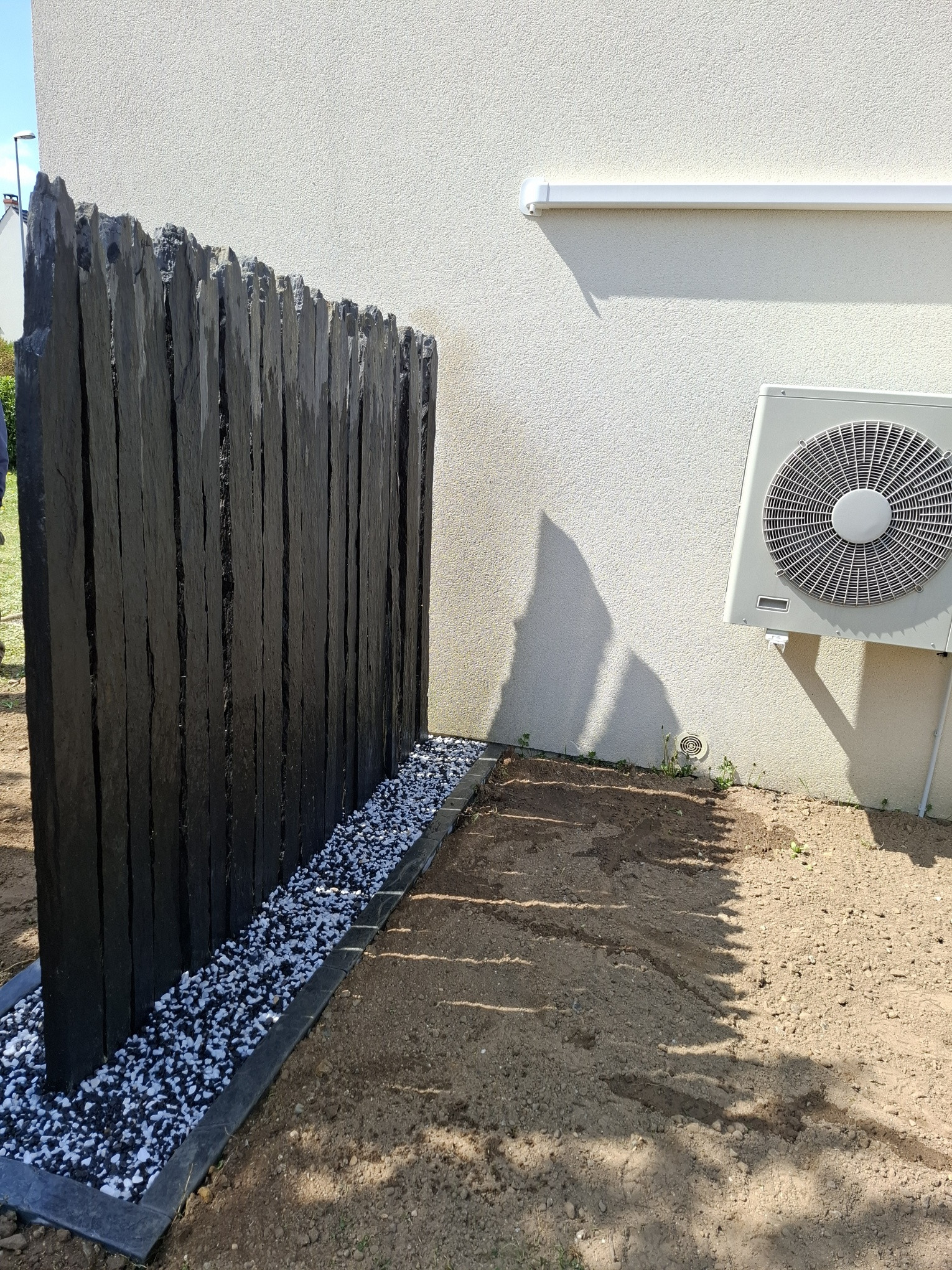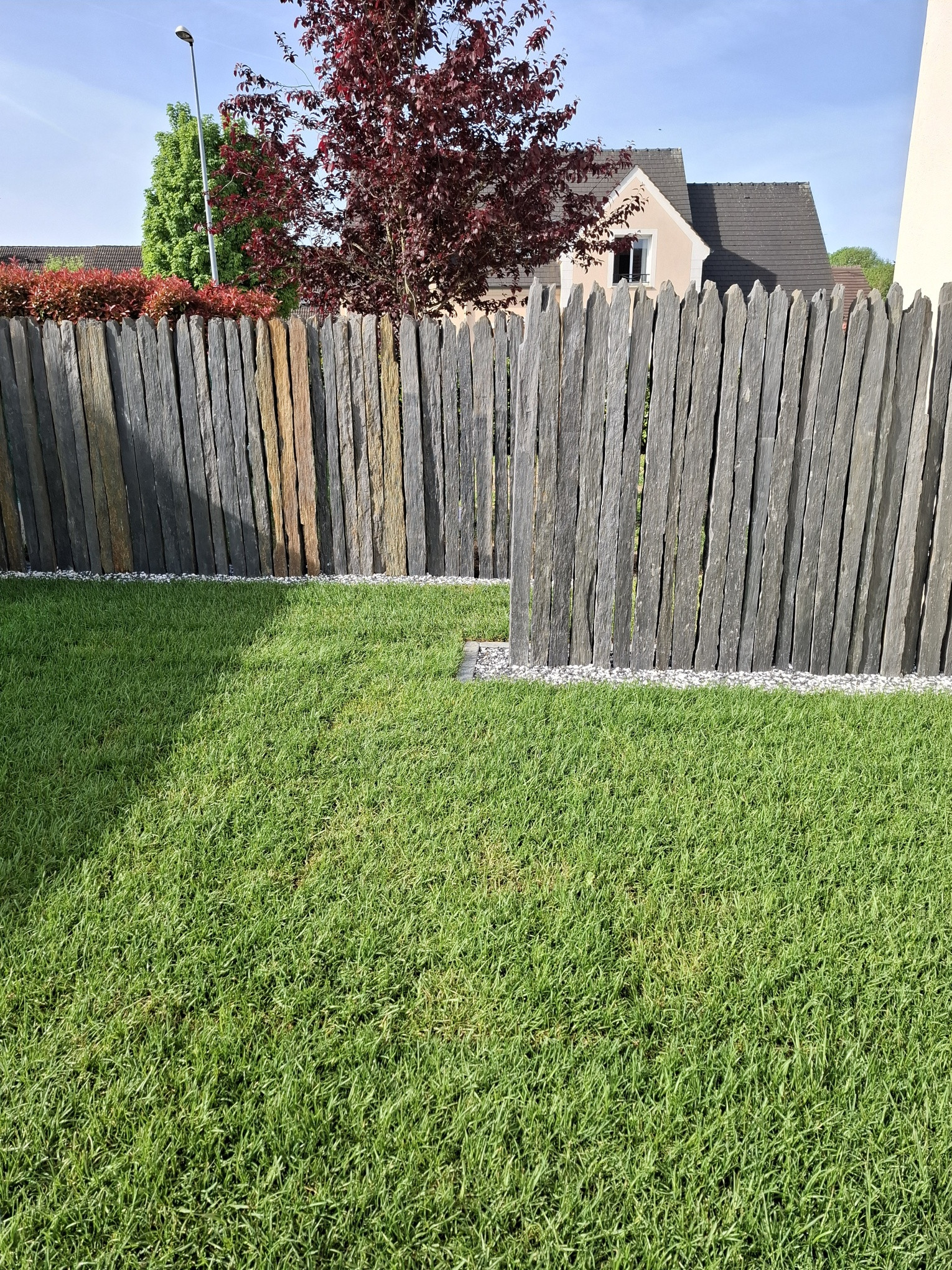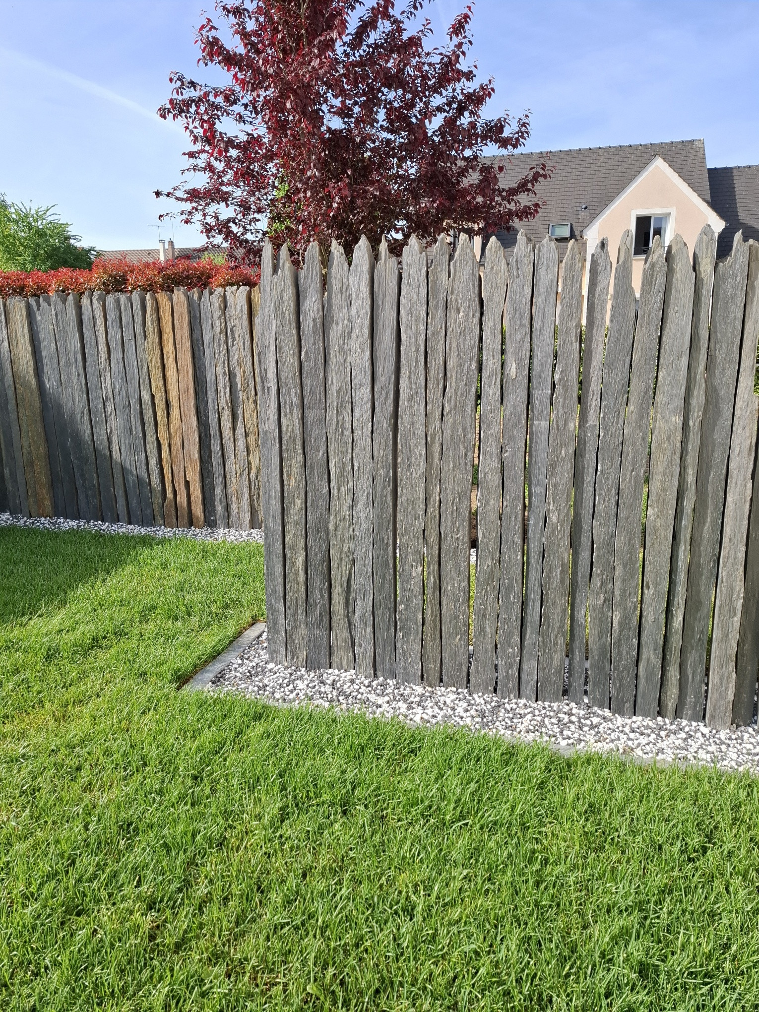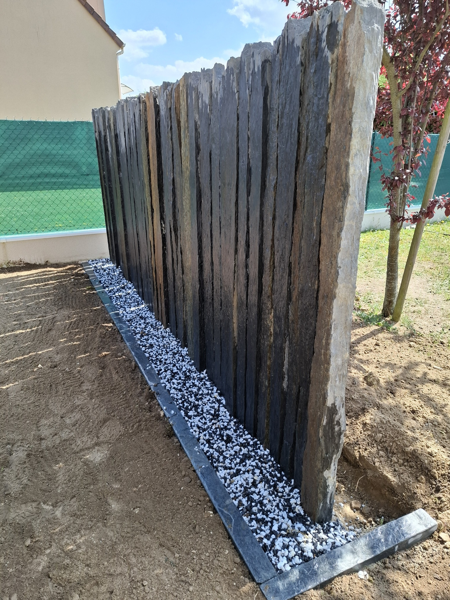 Création d'un brise vue en barrette de schiste et d'un gazon en plaque