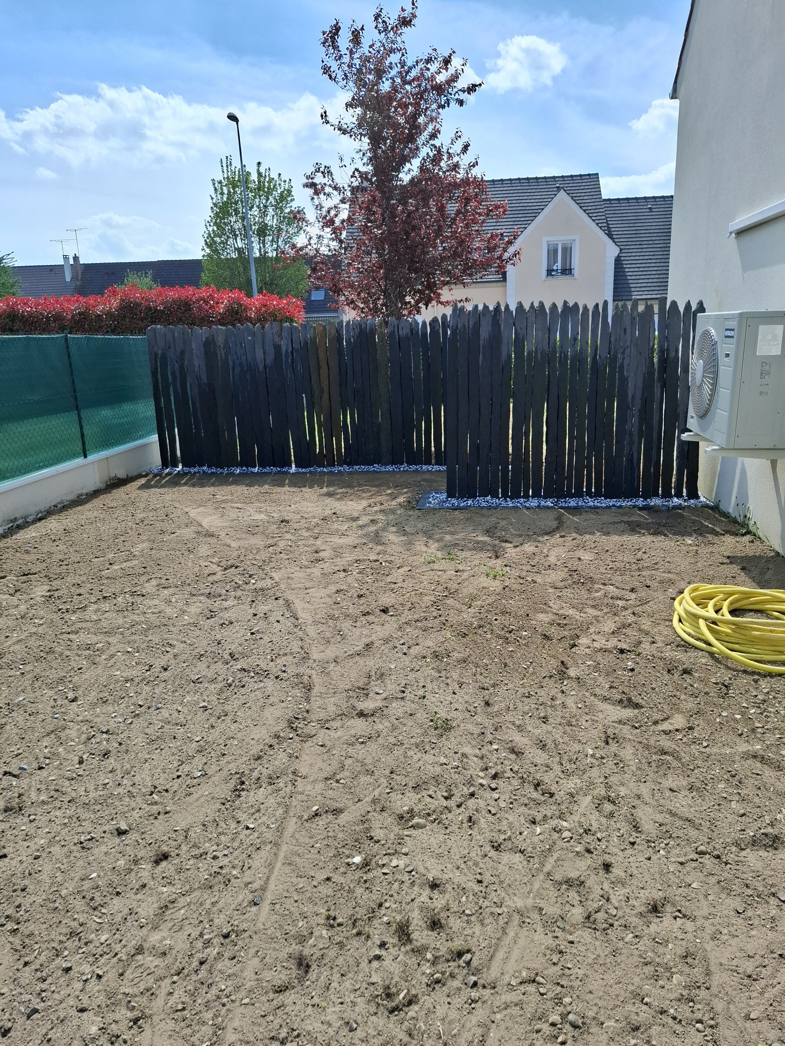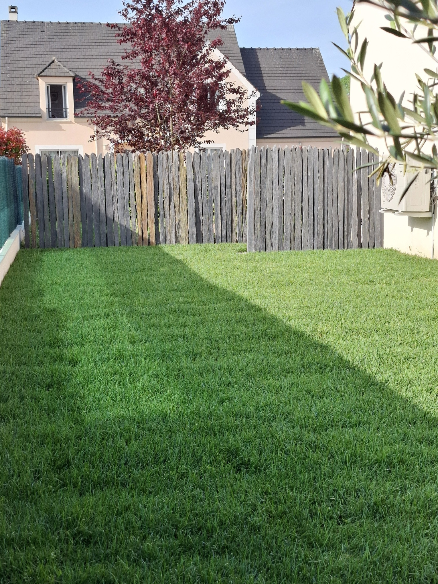 Création d'un brise vue en barrette de schiste et réalisation d'un gazon en plaque à Crépy en Valois